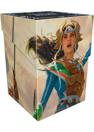 100+ Deck Boxes for Magic: The Gathering feature a vibrant, full-color artwork and includes a deck divider. Made with archival-safe, non-PVC, rigid polypropylene materials, you can store up to 100 double-sleeved cards with confidence. The self-locking lid keeps your cards securely stored when not in use, while also offering easy access. Sized for standard size trading cards.