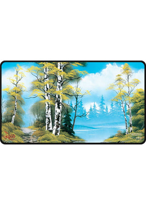 Every day can be a good day with Bob Ross tabletop accessories! Add some joy to your game space with the Lakeside Path black stitched playmat, featuring a Bob Ross original painting of a refreshing spring forest landscape of newly sprouted birch leaves against a brisk blue sky with fluffy white clouds reflected in a tranquil lake . Each playmat is made with a soft fabric top to reduce damage to cards, and features black stitched edges for an extra special premium feel. The non-slip rubber backing keeps the playmat from shifting during use. With dimensions of approximately 24 in. x 13.5 in., a playmat also makes an excellent oversize mousepad for home or office.